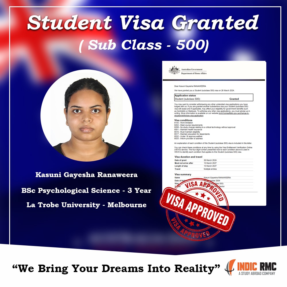 Kasuni granted student visa for her BSc Psychological Science degree at La Trobe University – Melbourne, Australia.